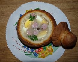Die Trockenpilze in kaltem Wasser einweichen. Karotten, Petersilie, Sellerie und Zwiebeln schälen, waschen und in Würfel schneiden. Alles in einem Topf mit 2,5 L. Wasser eine halbe Stunde kochen. Dann das Gemüse aus dem Topf herausnehmen. Weiβwurst in dicke Scheiben schneiden und in den Topf geben, Speck in Würfel schneiden, Pilze, Lorbeerblatt, Piment und Knoblauch in den Topf geben. Alles wieder eine halbe Stunde kochen. Dann Wurst, Speck und Pilze aus dem Topf herausnehmen. In den Topf Sauerteig , Gewürze und die Pilze zugeben. Die Suppe kurz kochen und wieder Gemüse und alle Zutaten zugeben. Vor dem Servieren die Sahne in die Suppe geben, auf dem Teller die gekochten Eierviertel legen und mit Sauerteigsuppe begieβen.